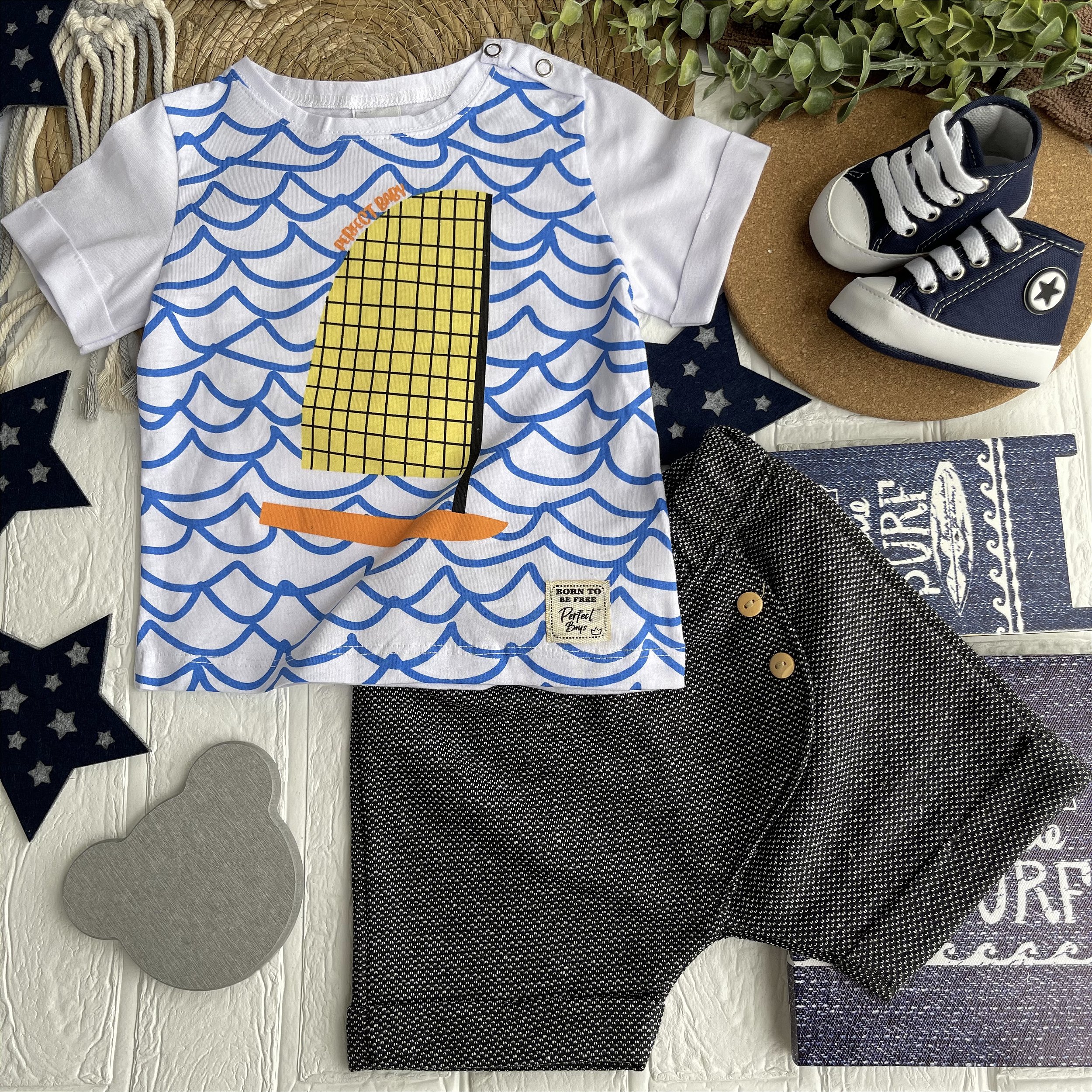 O Conjunto Barco é a escolha ideal para as crianças que adoram aventuras e estilo. Com um design divertido e alegre, este conjunto é perfeito para os dias de brincadeira e lazer, trazendo um toque náutico ao guarda-roupa.
