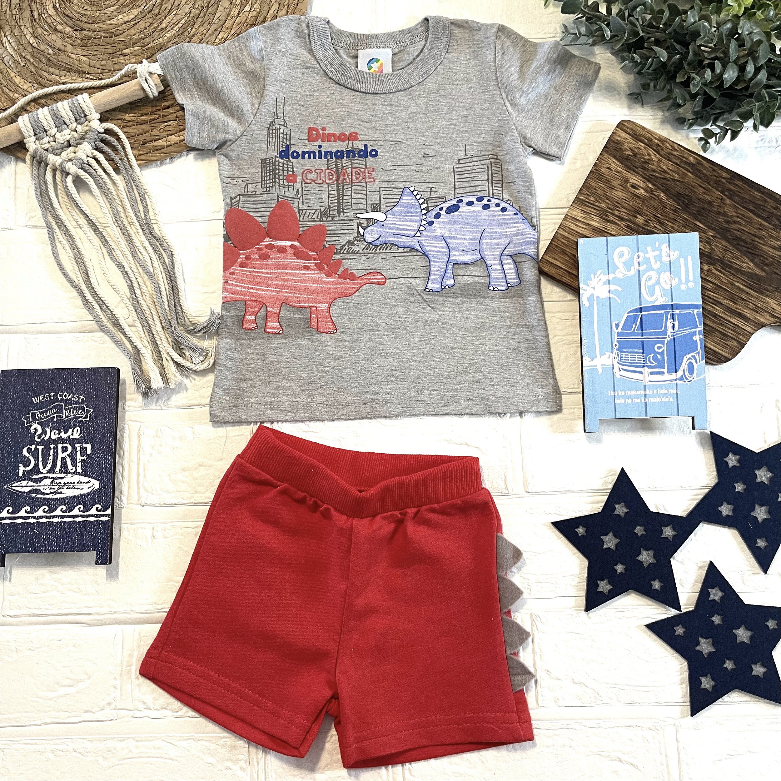 Detalhes: O design do conjunto apresenta estampas de dinossauros que vão encantar os pequenos, trazendo um toque de aventura e diversão ao visual.