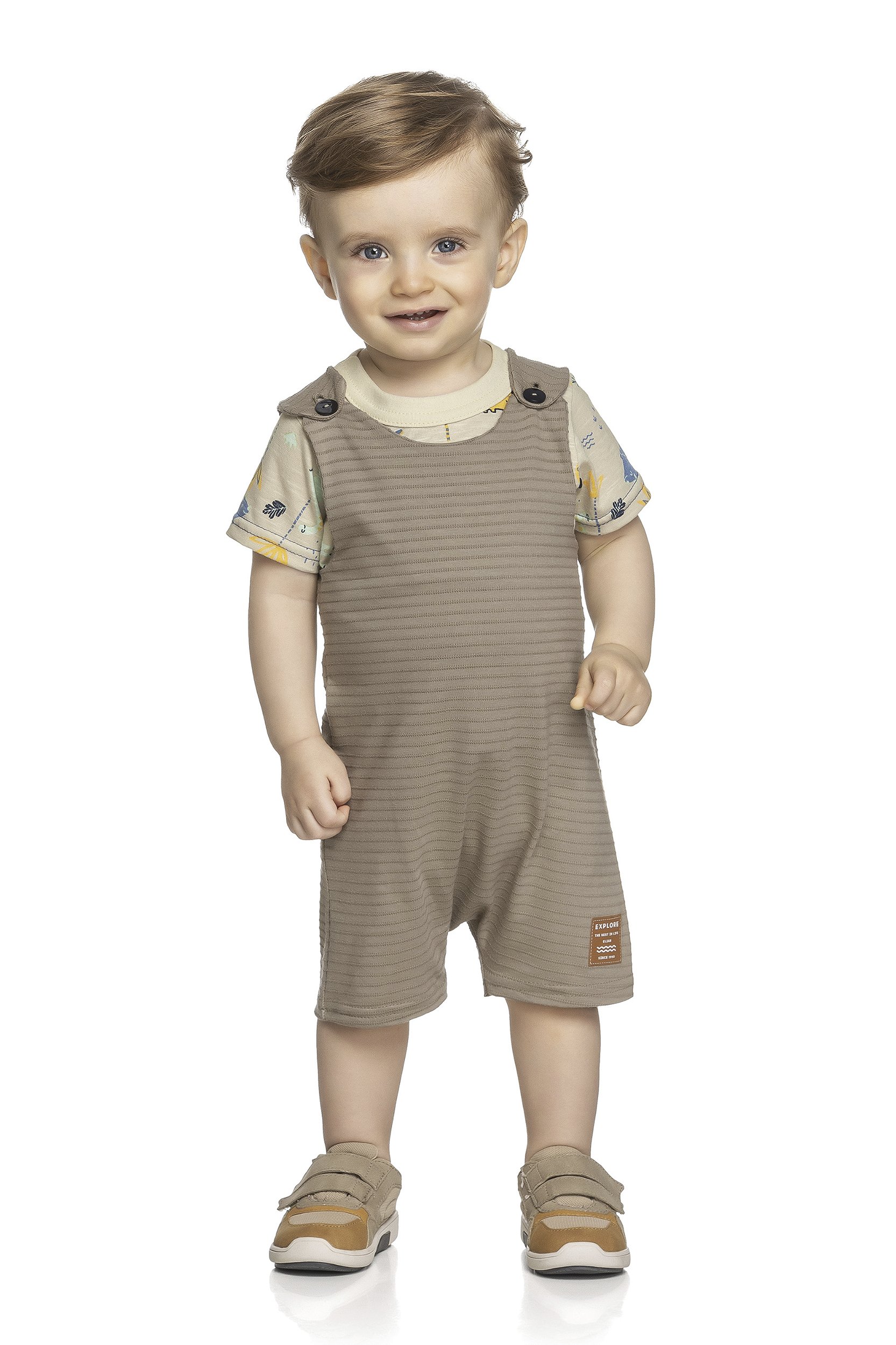 Descrição: O Conjunto Fabrício é a escolha perfeita para os pequenos que buscam conforto e estilo em um look divertido! Composto por um macacão curto marrom e uma blusa bege com estampas vibrantes, este conjunto é ideal para dias quentes e brincadeiras ao ar livre.