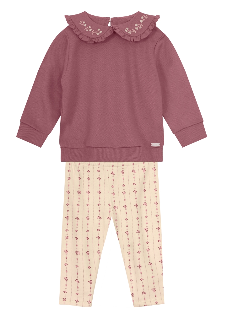 Detalhes: O conjunto combina uma blusa com gola decorativa e uma calça com estampa delicada, criando um visual harmonioso e moderno.