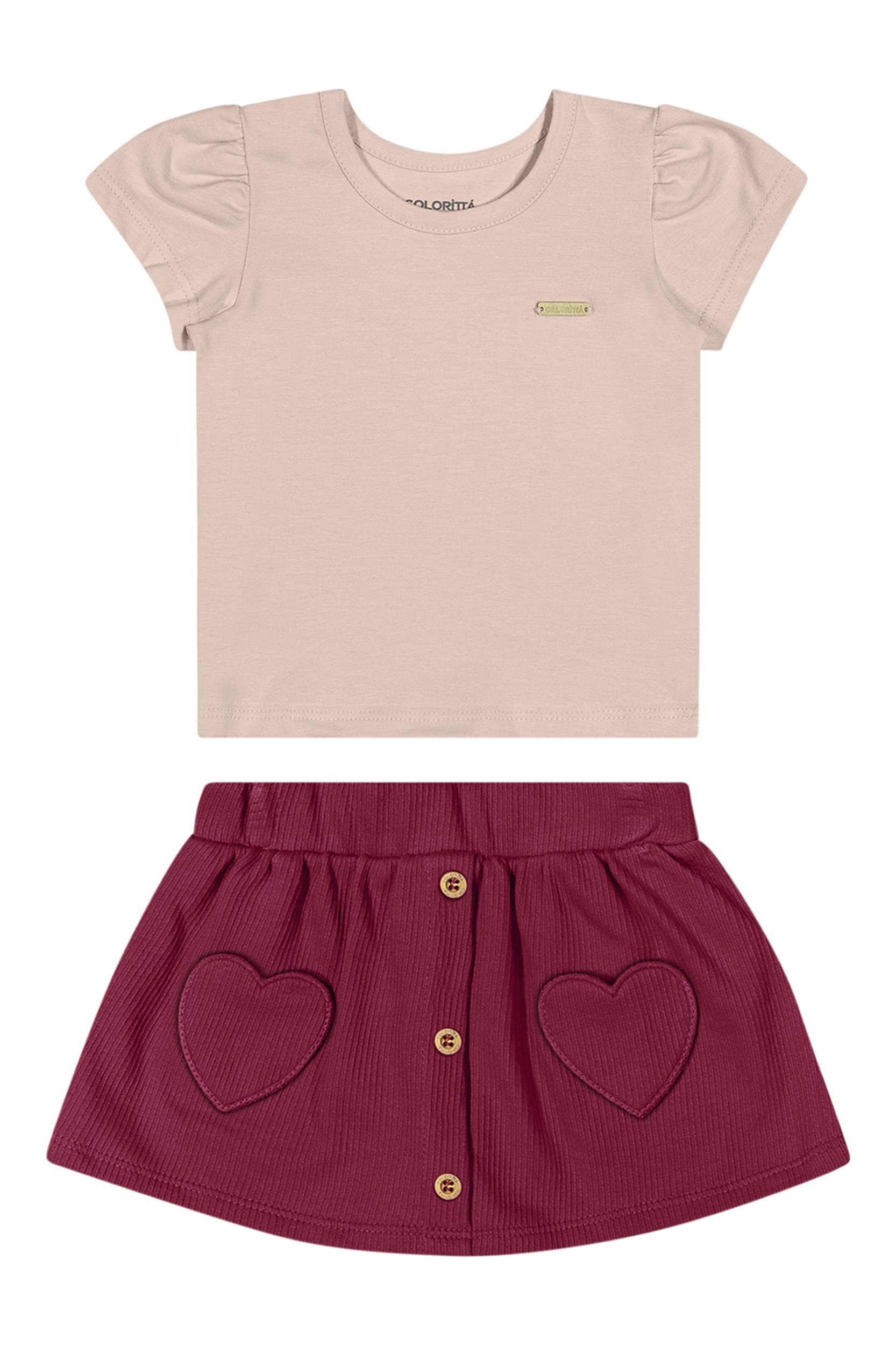 • Detalhes: Blusa rosa com mangas levemente bufantes, gola redonda e detalhe discreto na parte frontal. Shorts saia em tom mais intenso de rosa, com botões frontais decorativos e bolsos em formato de coração, que trazem um toque divertido e delicado à peça.