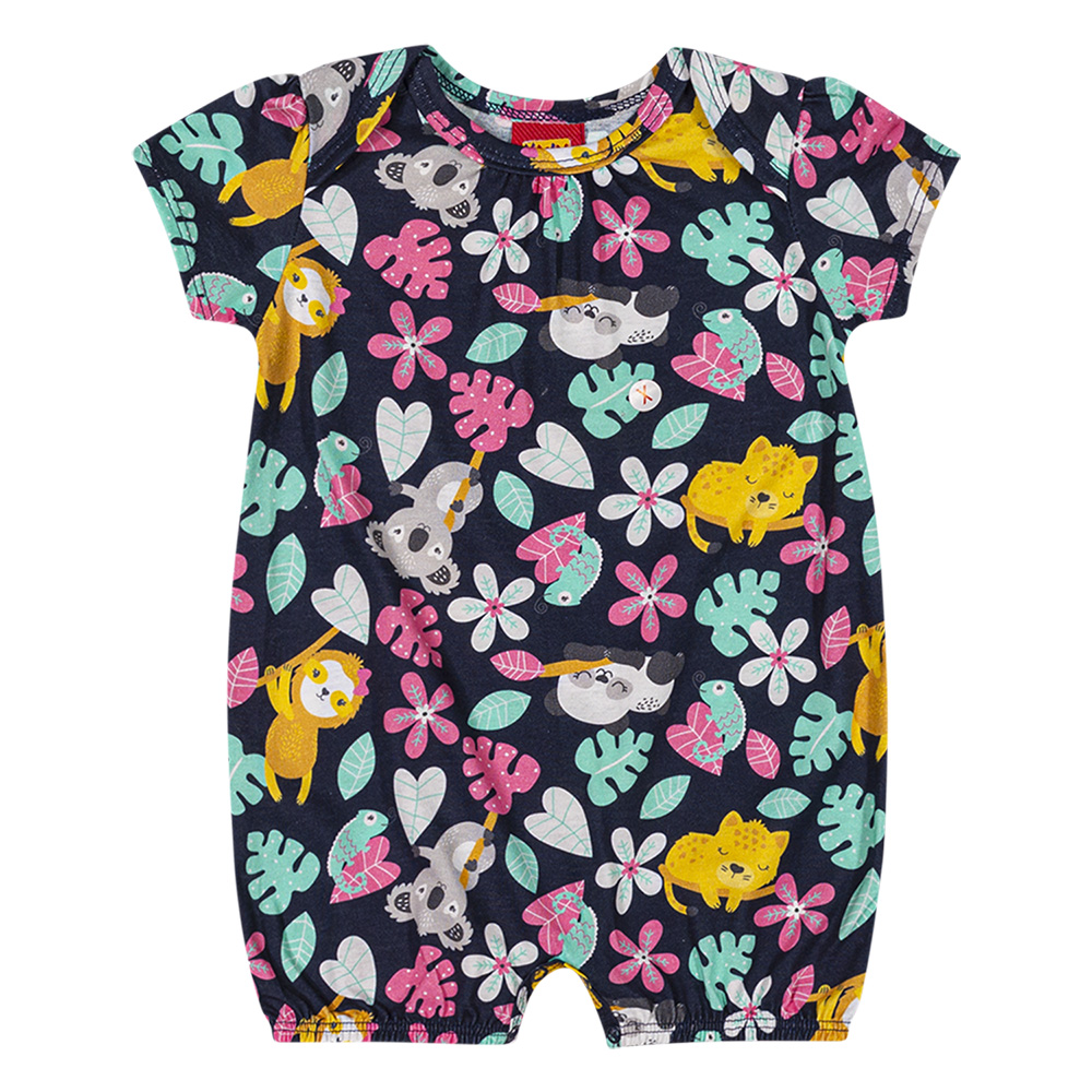 Estilo: O macacão exibe um padrão divertido e alegre, com diversos animais e flores em tons vibrantes, criando um visual cheio de personalidade.