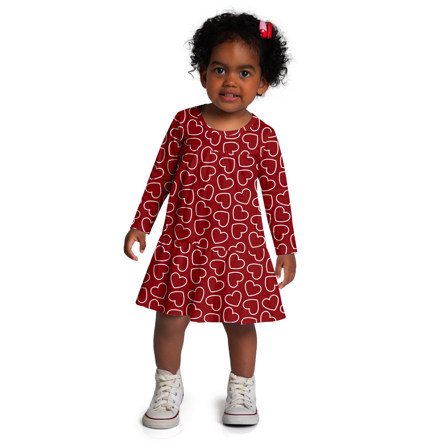 - Estilo: Vestido com mangas 3/4 e estampas de corações.