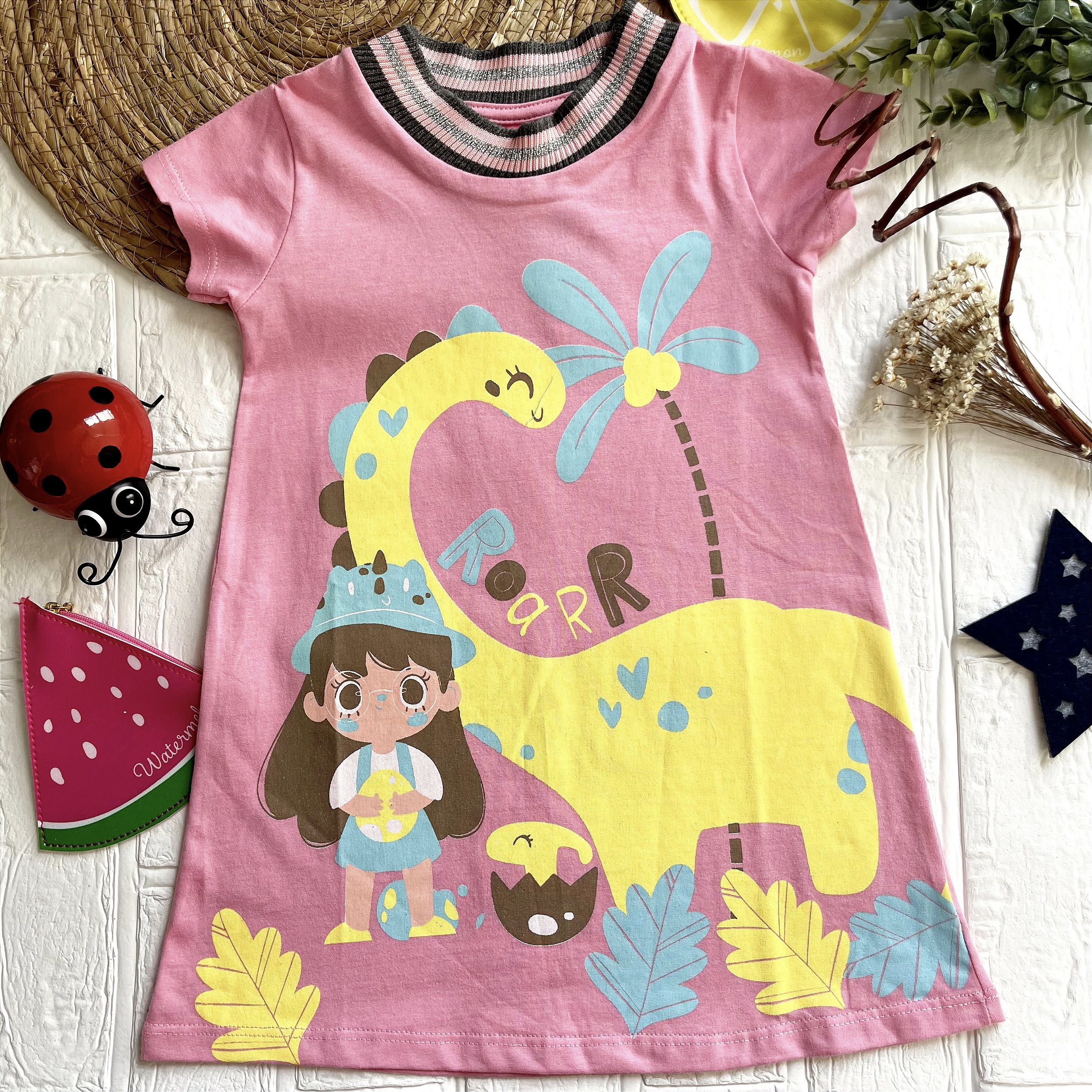 Detalhes: O vestido possui uma estampa divertida de dinossauro, com cores vibrantes e detalhes encantadores, proporcionando um visual único e criativo.