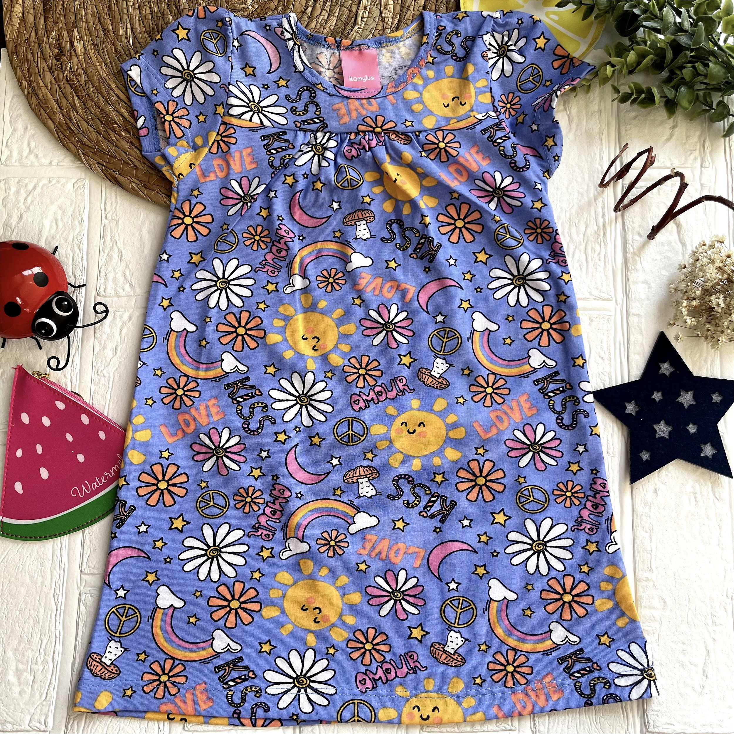 Detalhes: O vestido possui uma estampa encantadora com sol, lua, flores e elementos coloridos, proporcionando um visual alegre e original. O design é solto e confortável, ideal para brincar e explorar.