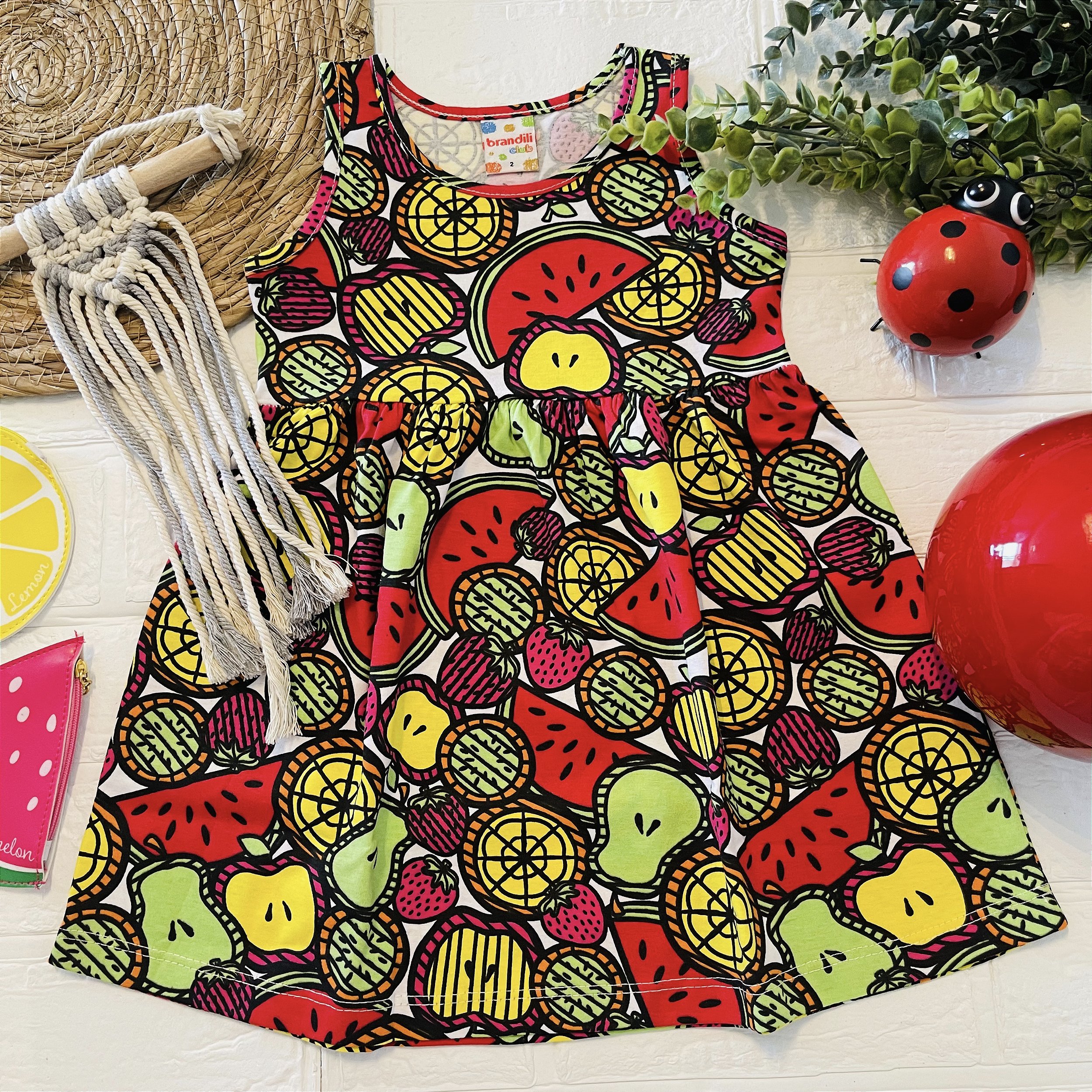 Detalhes: O vestido possui uma estampa vibrante de frutas em várias cores, com um corte solto e confortável, ideal para dias de brincadeira e verão.