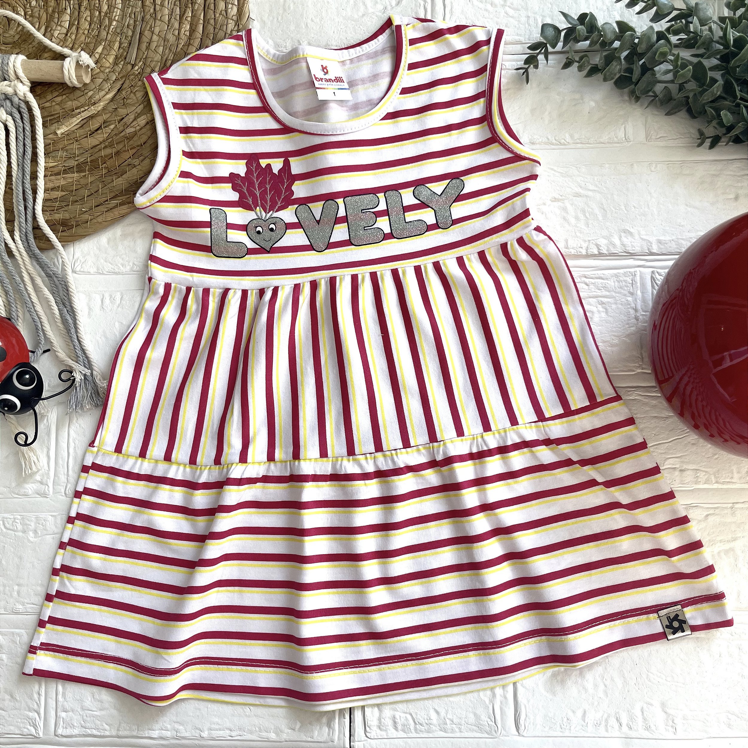 Estilo: Com listras suaves e um aplique adorável, o vestido é perfeito para criar looks fofos e modernos, adicionando um toque de charme ao guarda-roupa infantil.