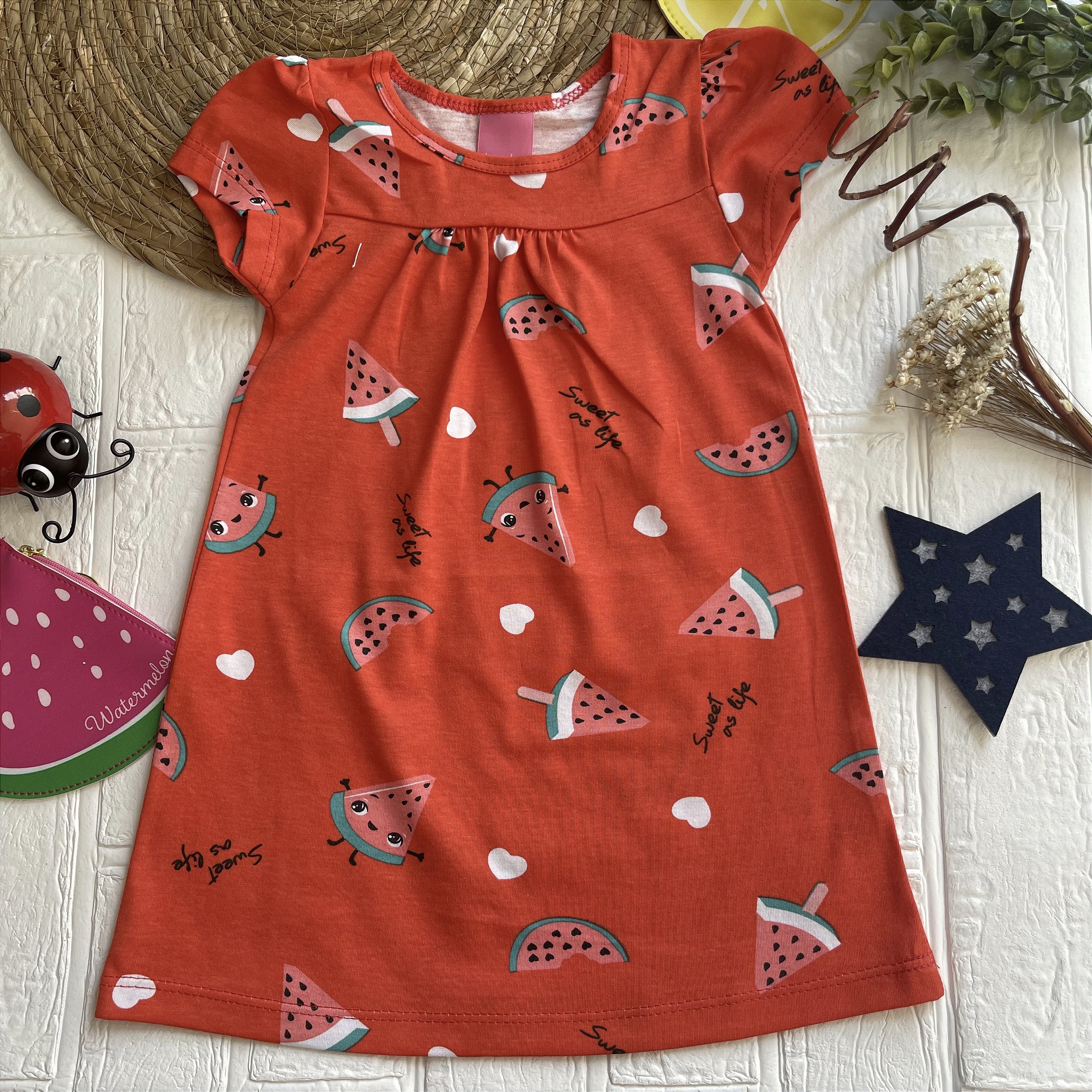 Estilo: Com uma estampa alegre de fatias de melancia, o vestido é ideal para criar looks descontraídos e fofos.