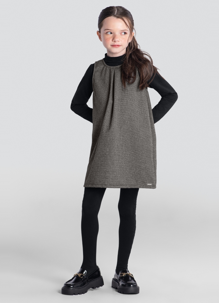 Material: A blusa é composta por 96% algodão e 4% elastano, enquanto o salopete (vestido) é composto por 100% poliéster.